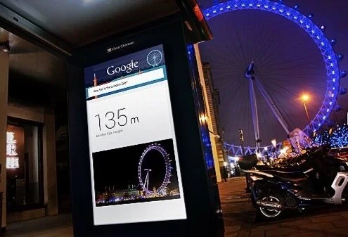 Hundreds of bus shelters across London showing, in real time, how Google can be helpful depending on location and time of day.